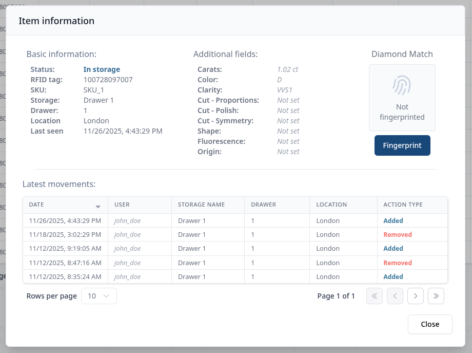 Once your drawer is connected to our system, every tag put into it will automatically be added in your inventory as a polished diamond. Initially the item will only have its RFID number property. Users are encouraged to add an SKU property to it and then attempt to fingerprint it using Spacecode's PolishedMatch or JewelMatch device.