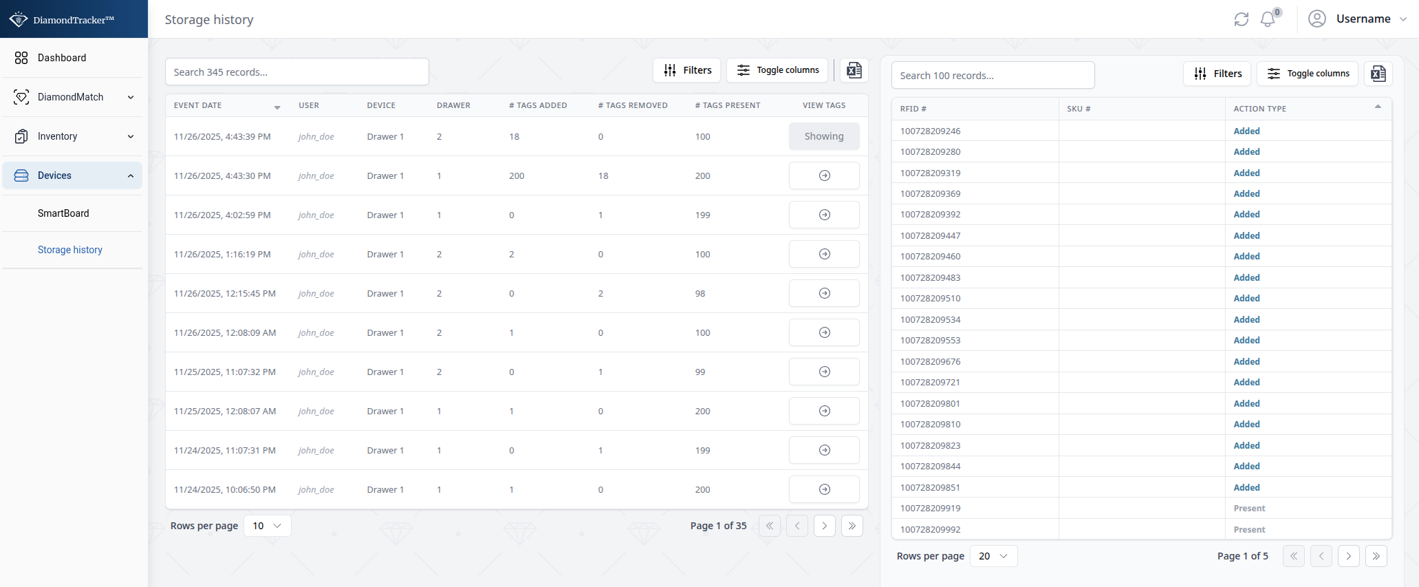 You can also view your drawer's actions in Devices/Storage history (or follow this link). In this screen you can view all the actions made in your drawer device alongside: