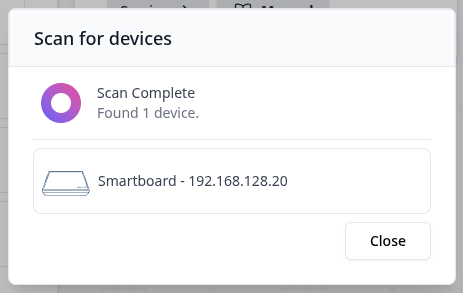 Through the Maintenance or the Dashboard page of the DiamondTracker inventory solution you can connect to your Smartboard device through the Scan Smartboards button. This will open a popup prompting you to press the Search button. Once you do, the DiamondMatch service will attempt to scan your local network in order to find your device.
